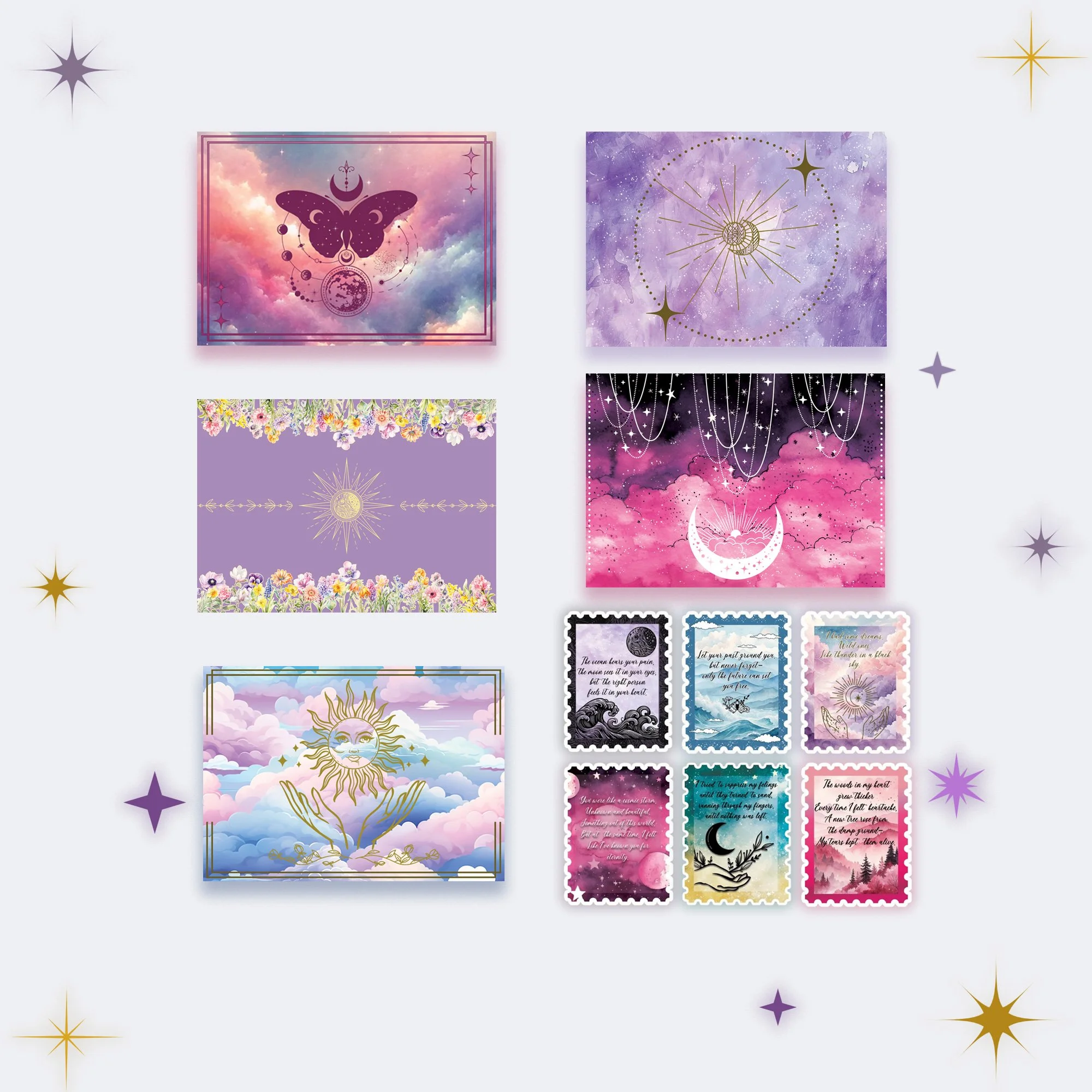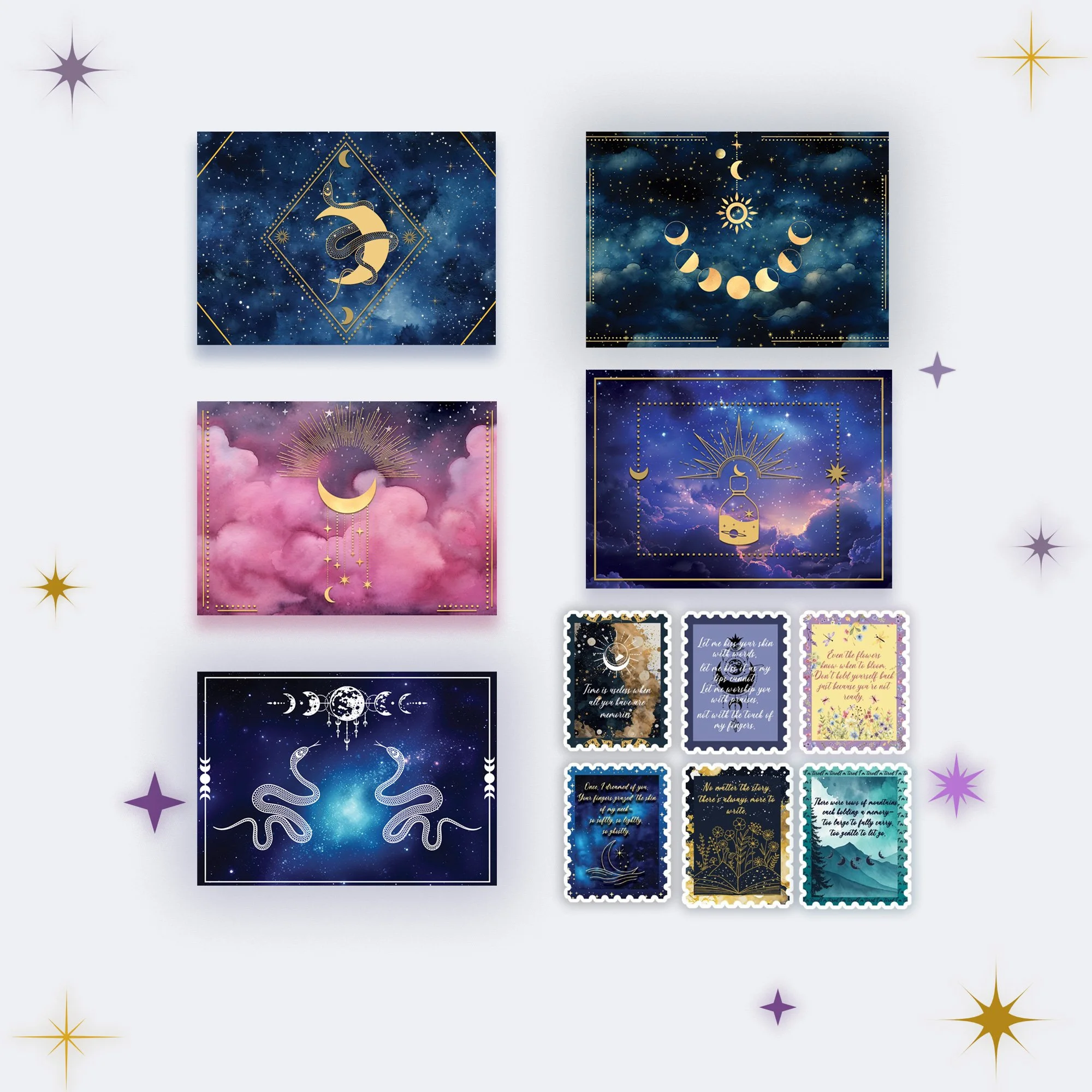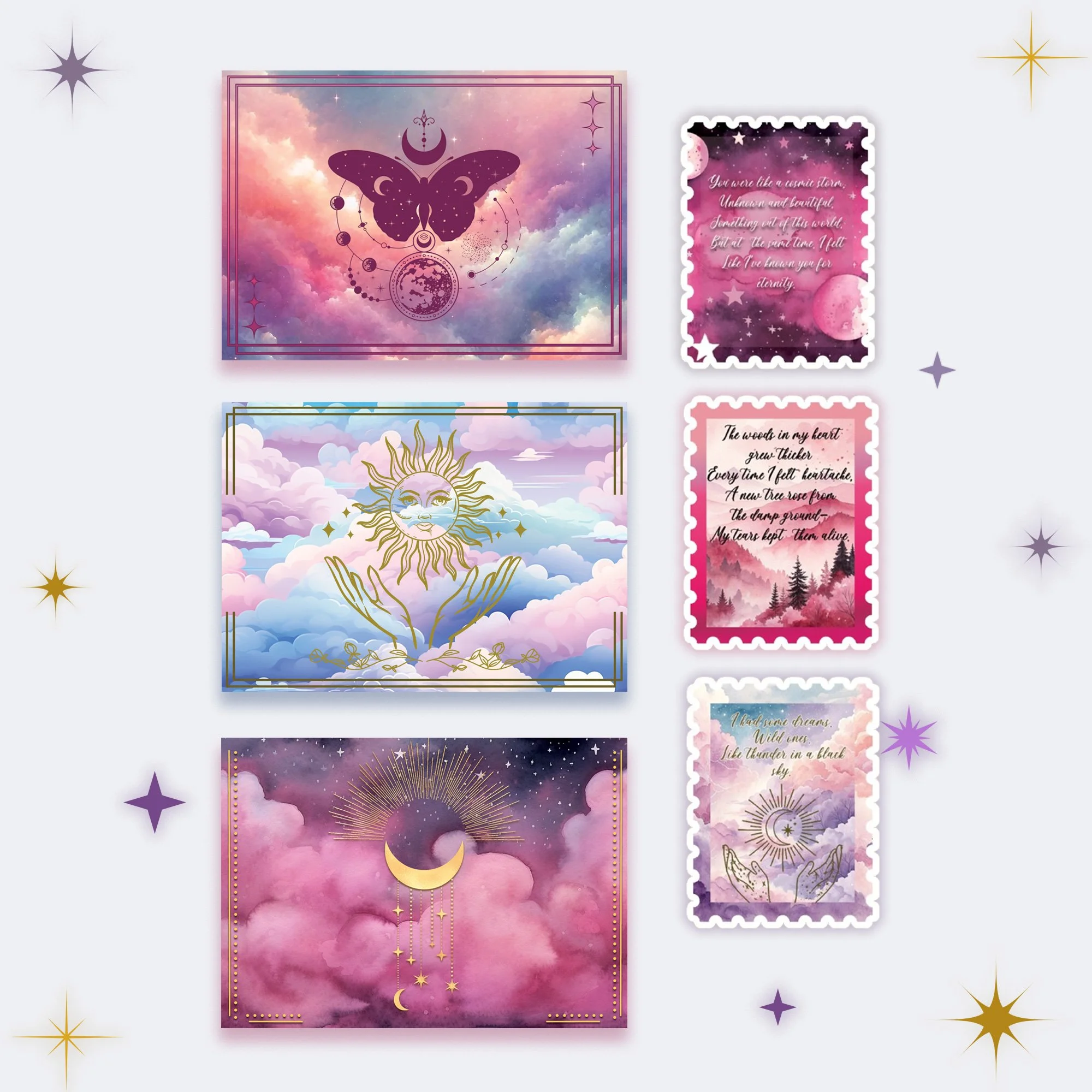 Choose from seven celestial bundles, each a carefully woven trio of postcards — soft as moonlight, bright as sunrise, or quiet as dusk. Whether you’re sending a secret, a wish, or a poem, these dream-bound cards carry more than words — they carry wonder.